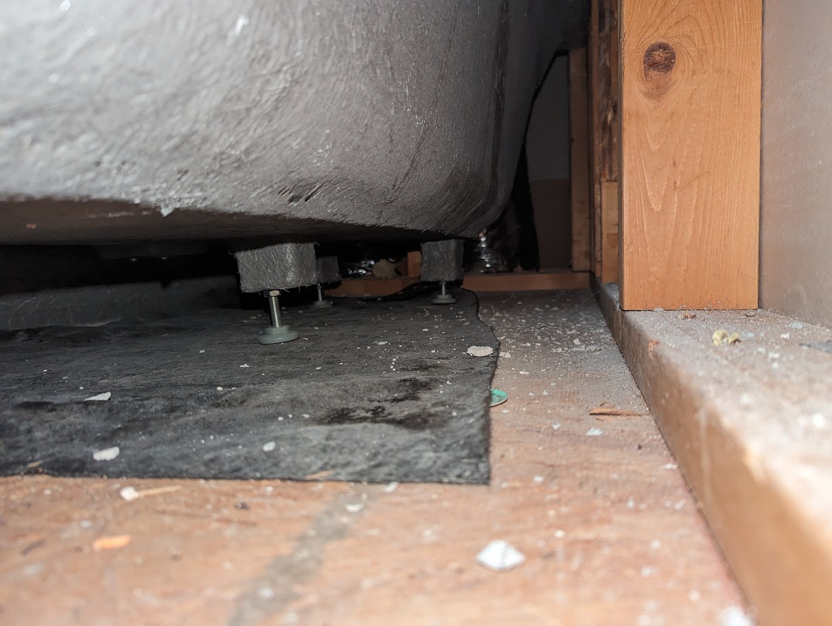 The waterfall flooding wasn’t the only issue with the upstairs tub/shower. NFM didn’t bother to put support underneath, per installation instructions. Instead, it was sitting on leveling feet, and those feet weren’t even level. For about three months this was our only working shower (once the flooding issue was repaired, of course). Not real fun as a family of four, and the tub bottom felt squishy and unstable while using it. Our entire family continually felt like we might fall through the floor of the tub at any moment while showering.